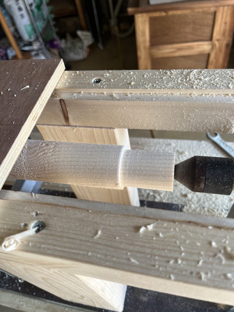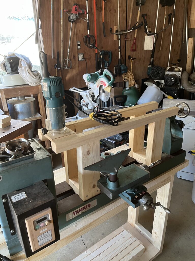 市販品ではマキタ純正の仕組みには及びませんが、Amazonなどで比較的安価なトリマースタンドが販売されていたため、それを取り付け、旋盤上をスライドさせながら、荒削りした角材を丸棒へと仕上げていく方法を採っています。