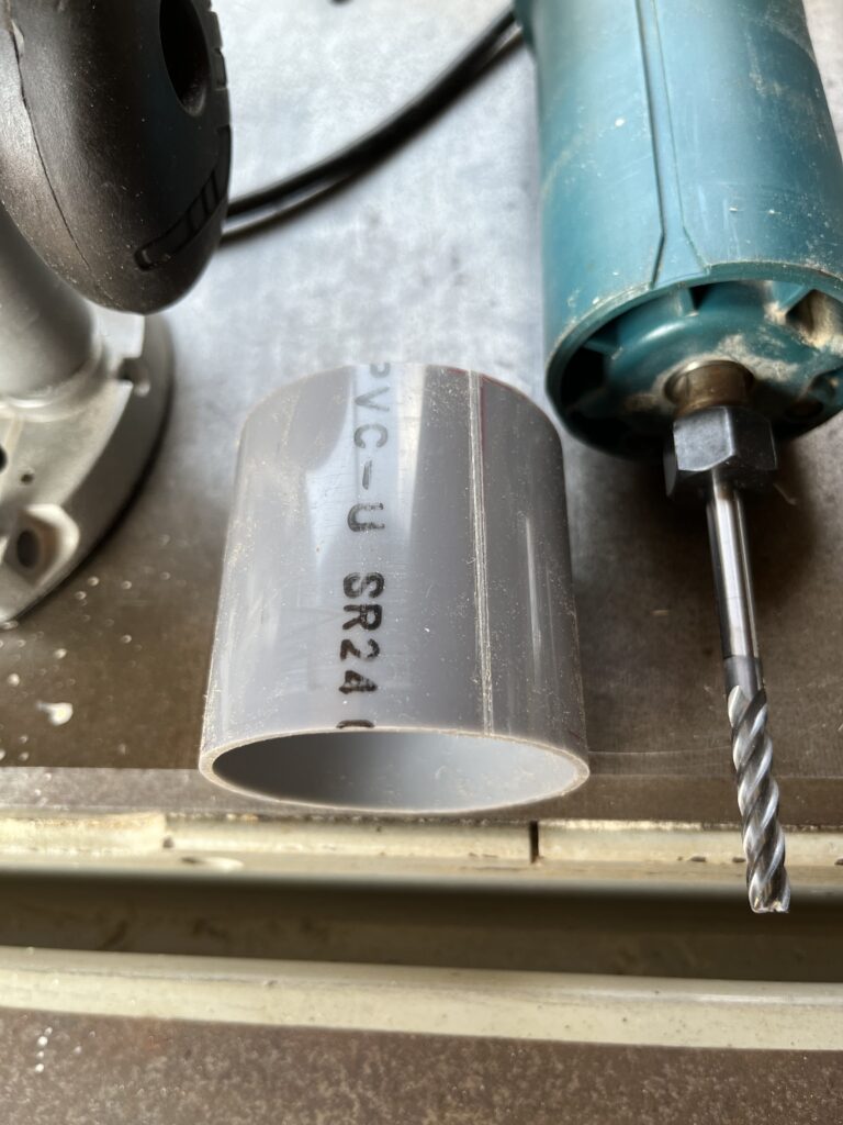 そのため、水道配管用のVU60管を切断し、カラーのように介在させて、トリマーをトリマースタンド側に固定できるようにしています。