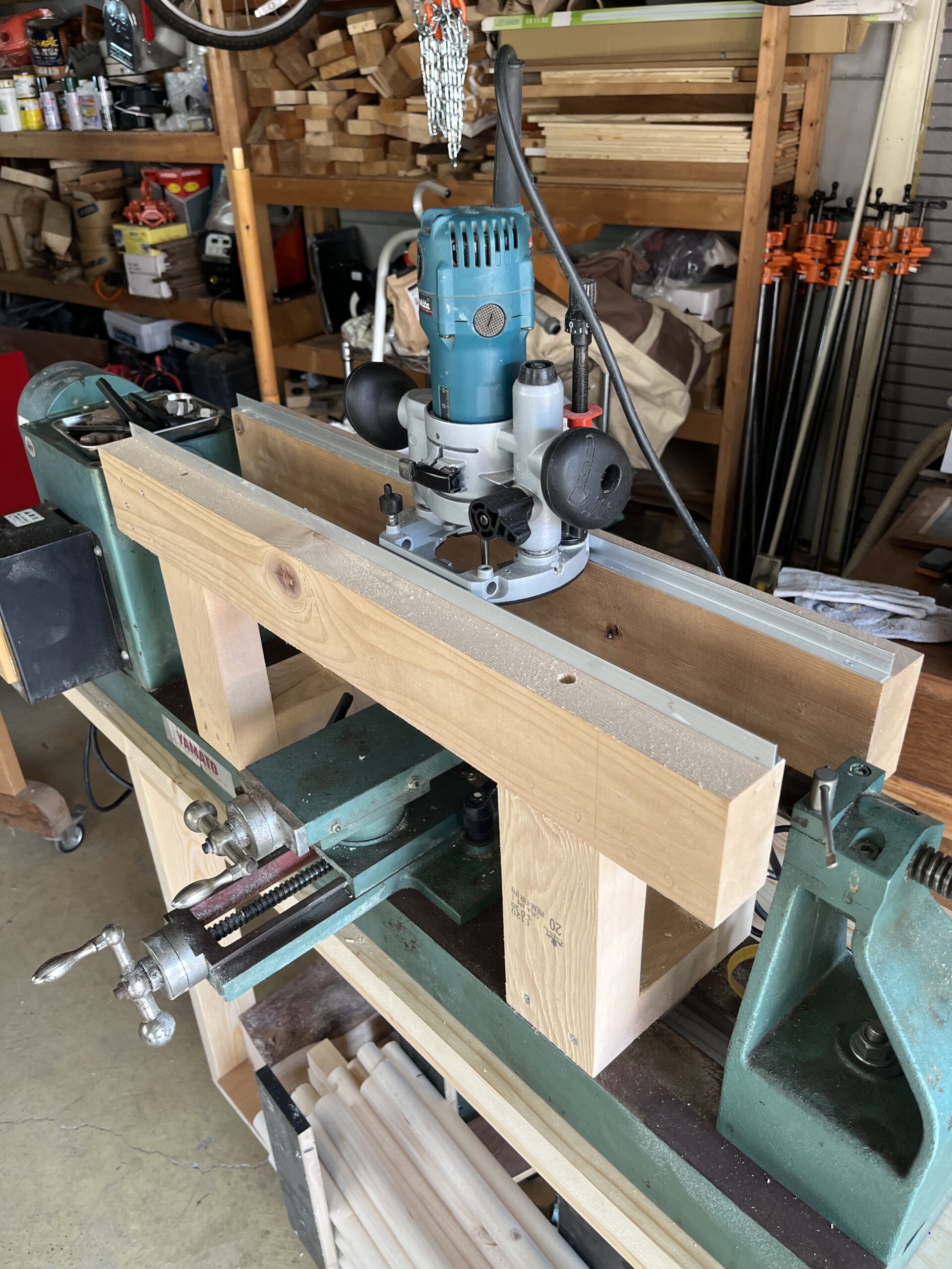 市販品ではマキタ純正の仕組みには及びませんが、Amazonなどで比較的安価なトリマースタンドが販売されていたため、それを取り付け、旋盤上をスライドさせながら、荒削りした角材を丸棒へと仕上げていく方法を採っています。