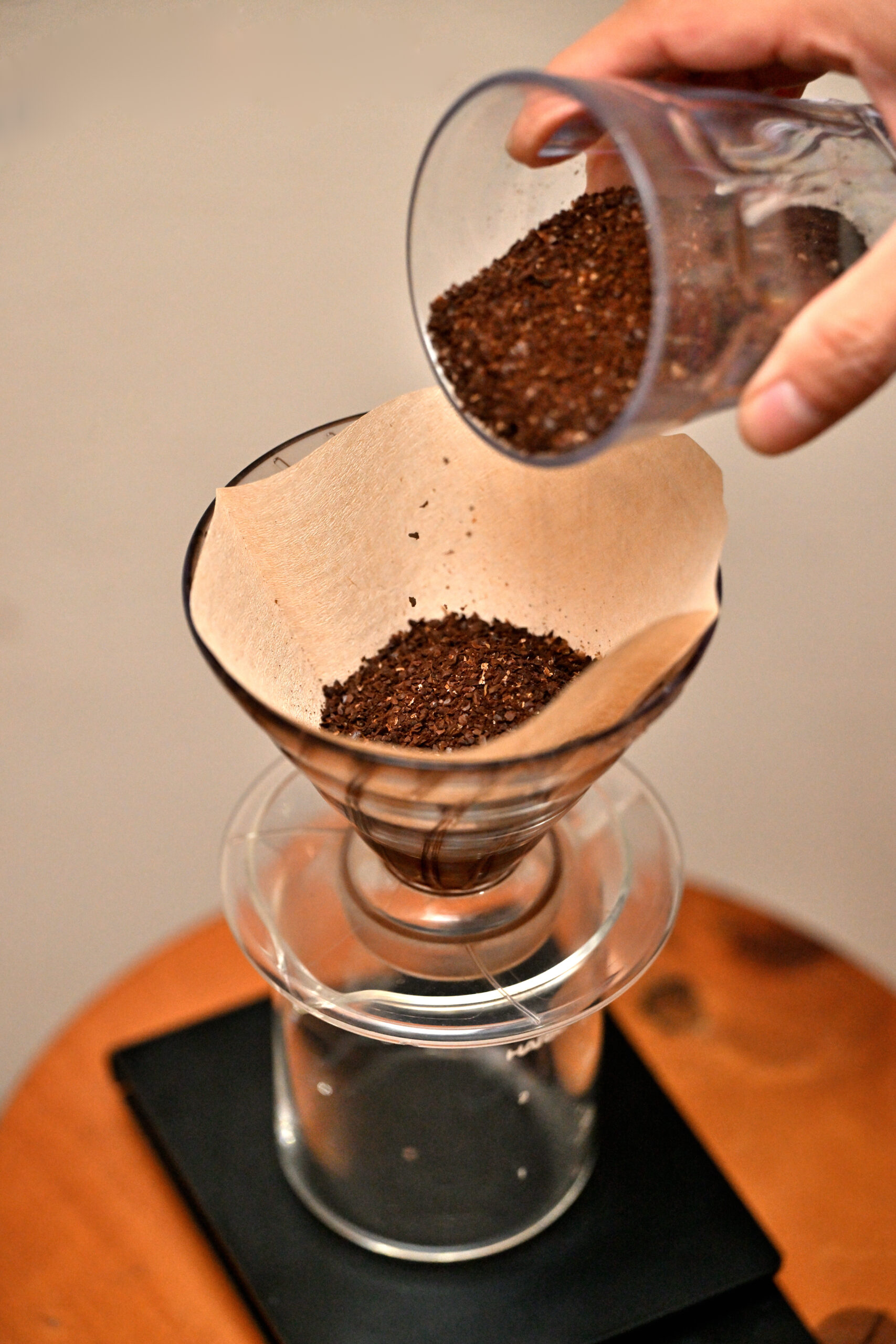 1.中挽き粉を30gをセットしたドリッパー、ペーパードリップに入れて軽く平に均します。