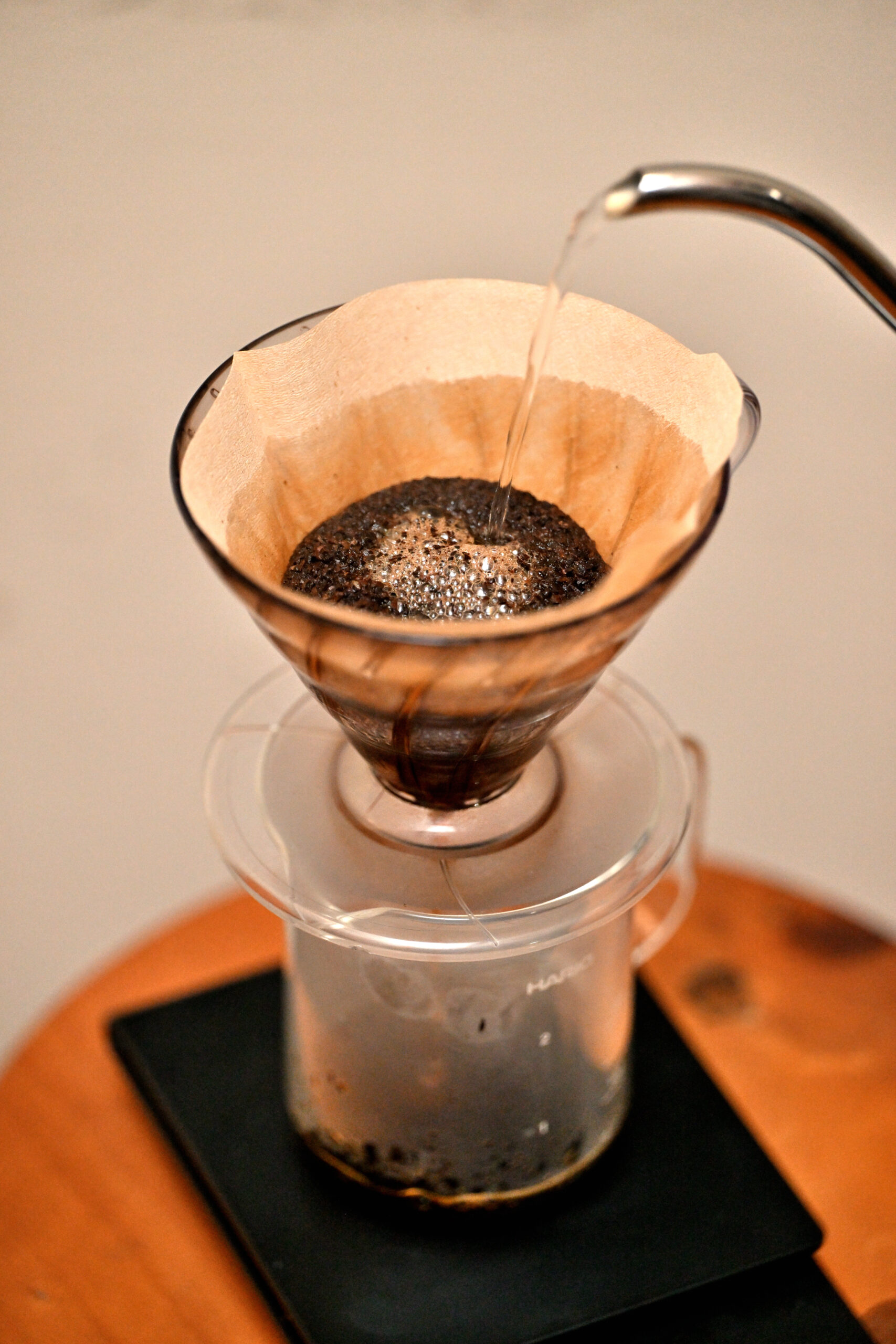 私の場合はこの二回目の浸湯でコーヒーの上面が平らになる様なイメージでお湯を注ぎます。